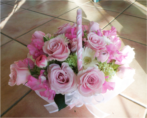 赤ちゃんが生まれた時のお祝いに、フラワーアレンジメント贈られるお客様も多くいらっしゃいます。生まれた赤ちゃんの性別に合わせて、男の子だったら黄色、女の子だったらピンクなどで花束を作ってプレゼントされると喜んでいただけるようです。また、最近は色やお花から名前を付けられる方もいらっしゃいますから、季節が合えばそんなエピソードを花束で表現して、贈るのも素敵だと思います。